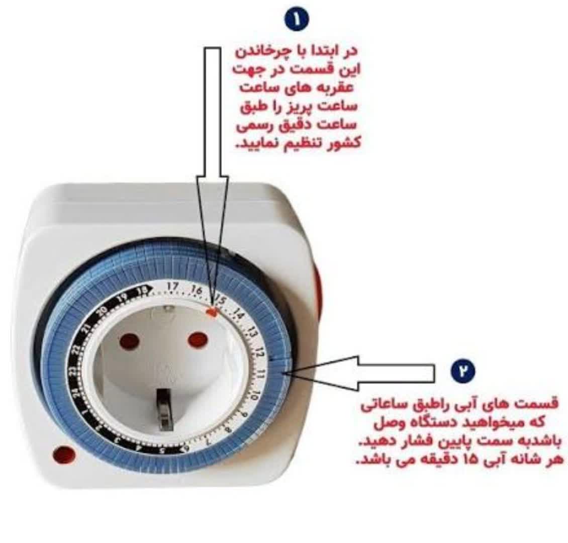تایمر 24 ساعته پریزی پارس اروند ساخت کشور ایران میباشد. این تایمر قطع و وصل خودکار برق در واقع یک دستگاه زمانسنج است که میتواند در ساعات و دقیقههای مشخص که شما تعیین میکنید جریان برق را قطع یا وصل کند. به سخن دیگر این دستگاه را شاید بتوان یک پریز برق تایمردار نامید. محصول فوق برای مصارف مختلفی طراحی و ساخته شده که برخی از آنها عبارتند از: لوازم برقی داخل آشپزخانه، آکواریوم ، پکیج ، پمپهای آب ، تابلوی مغازه، مودم اینترنت و سایر مصارفی که نیاز به کنترل تحت زمان خاصی دارند. با استفاده از این محصول شما می توانید مویایل خود را با خیال راحت هنگام خواب به شارژ بزنید و بر اساس زمان دلخواه آن را تنظیم نمایید تا شارژ شود. روش تنظیم تایمر به این صورت است که : ابتدا حلقه ی پین های تایمر را به سمت عقربه های ساعت بچرخانید تا فلش قرمز رنگ روی زمان فعلی ، دقیق تنظیم شود سپس تایمر را به برق وصل کنید، هر کدام از پین های آبی رنگ 15 دقیقه میباشد که میتوانید با فشار دادن به سمت پایین ، تنظیم کنید که تایمر در این 15 دقیقه خروجی بدهد.