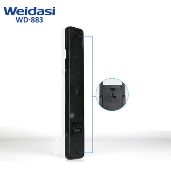 چراغ اضطراری دیواری شارژی ویداسی مدل WD-883 یک محصول کاربردی با طراحی شیک و مقاوم است که برای روشنایی در شرایط اضطراری طراحی شده است. بدنه این چراغ از جنس پلاستیک ABS مقاوم و به رنگ سفید ساخته شده و دارای 60 عدد لامپ SMD LED است که نوری سفید و یکنواخت تولید می‌کند. این چراغ با دو عدد باتری لید اسید کار می‌کند و ورودی آداپتور آن 6 ولت و 1 آمپر است. برای عملکرد بهینه، مدت زمان شارژ اولیه 12 ساعت توصیه می‌شود.